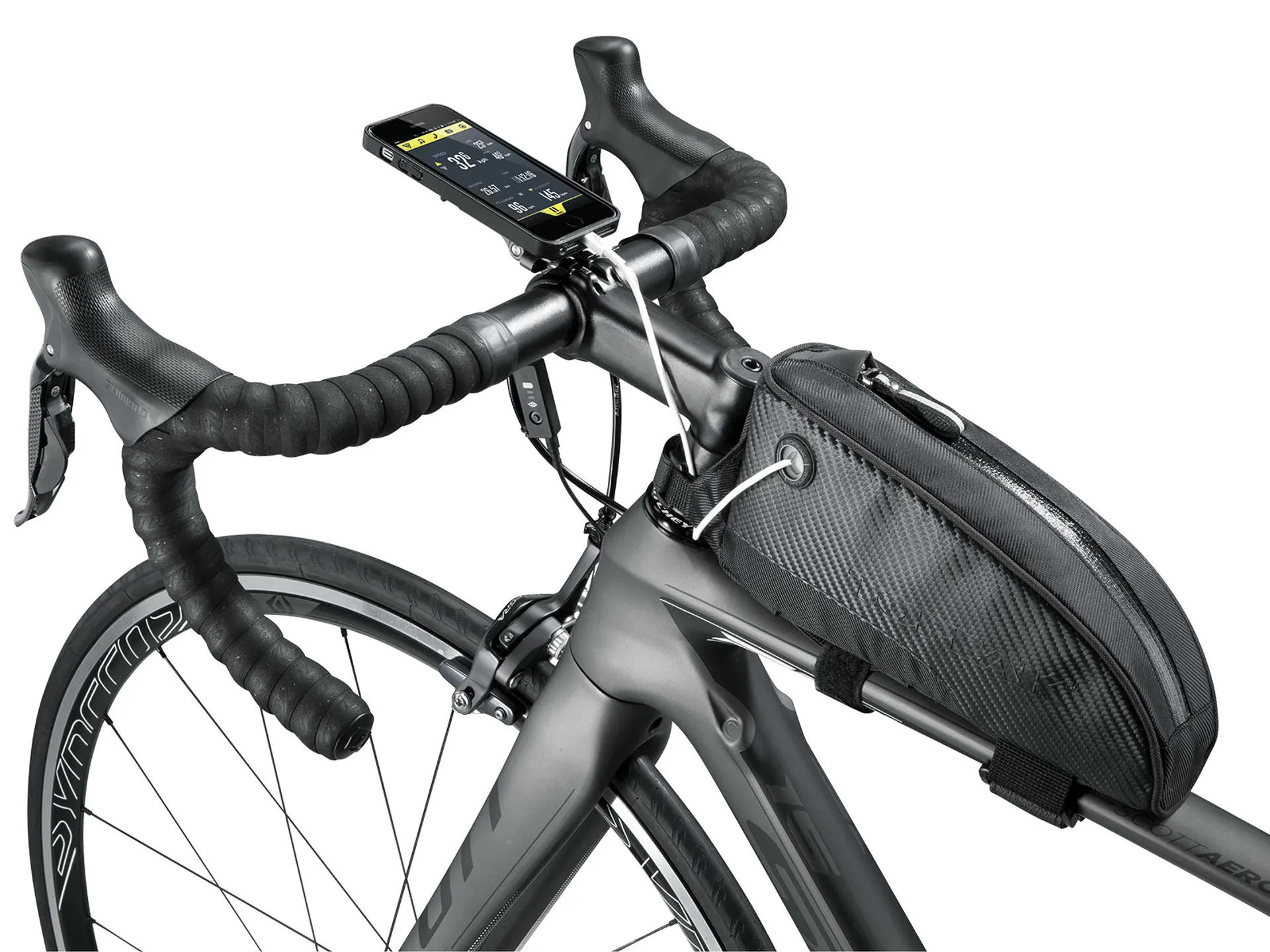 Large capacity top tube mounted bag giving cyclists quick and easy access to energy bars, phone, wallet, tools or any small essential gear they need close at hand. Features battery cable access for charging a mobile device.